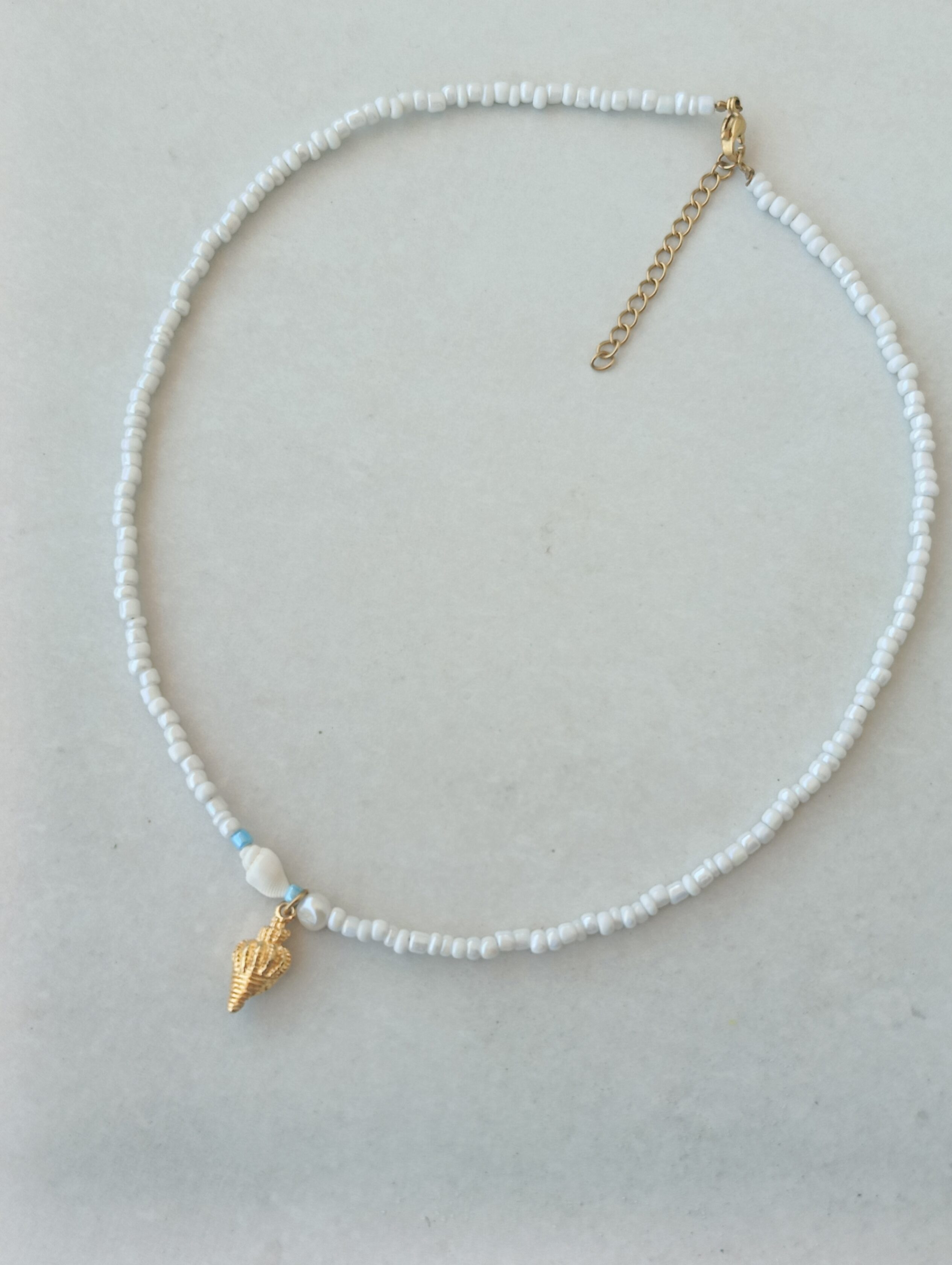 Χειροποίητο κολιέ με λευκές χάντρες και κοχύλι για απόλυτα καλοκαιρινή διάθεση.