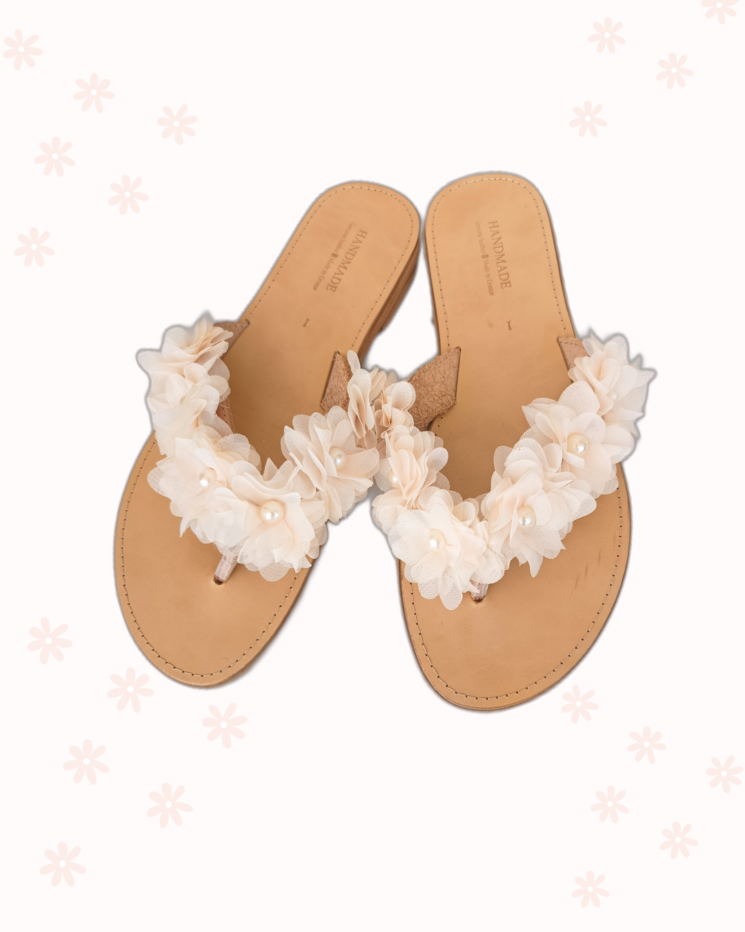 Χειροποίητο γυναικείο σανδάλι με διακοσμητικά λουλούδια και πέρλες, διαθέσιμο και για σετ μαμά-κόρη. Ιδανικό για καλοκαιρινές εκδηλώσεις.