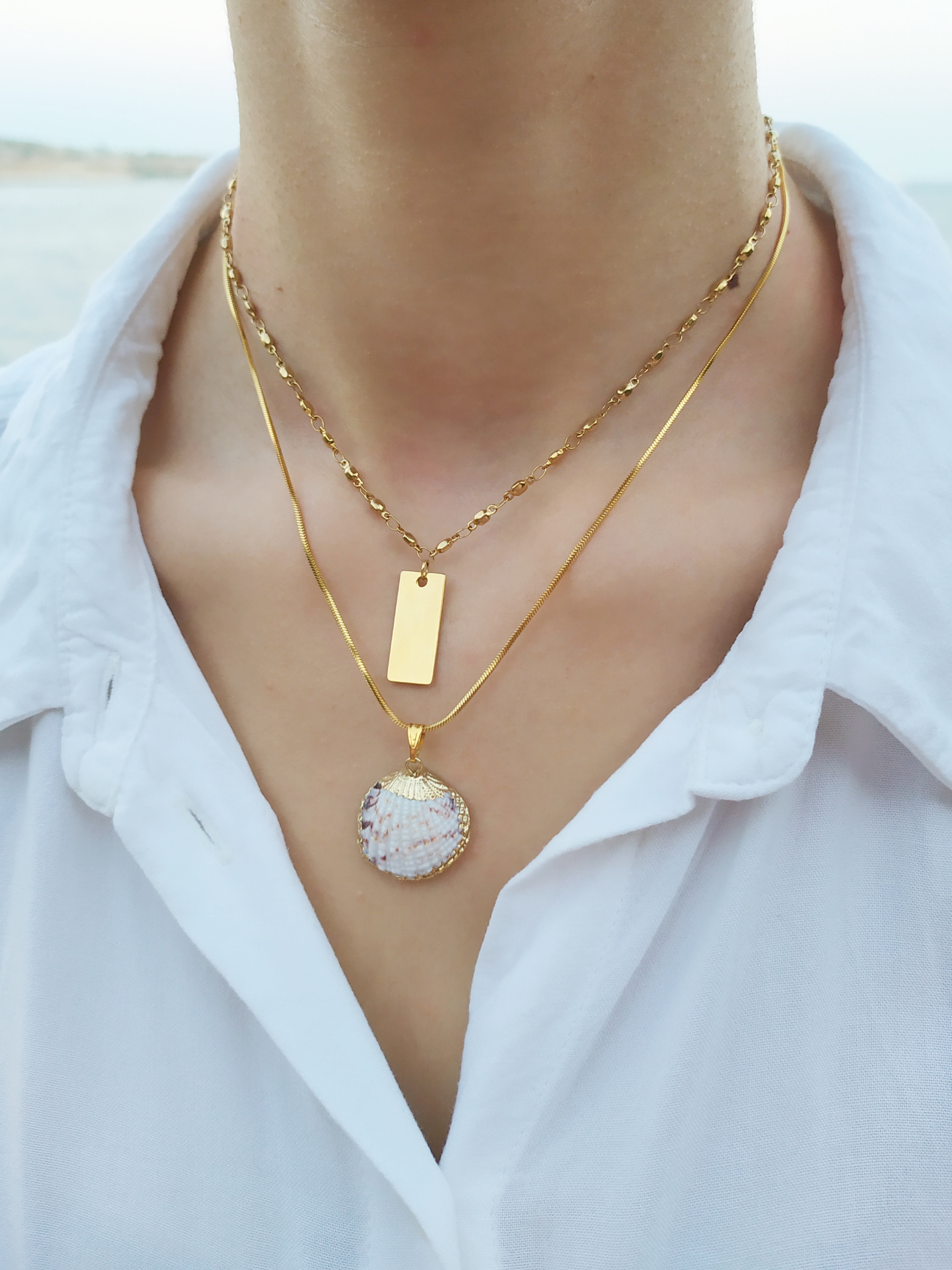 Απογείωσε το καλοκαιρινό σου στυλ με αυτό το μοναδικό σετ από δύο ατσάλινα κολιέ! Το ένα διαθέτει ένα εντυπωσιακό φυσικό κοχύλι διακοσμημένο με χρυσές λεπτομέρειες, ενώ το δεύτερο κομμάτι συμπληρώνει ιδανικά την εμφάνιση με μια minimal χρυσή ταυτότητα. Σχεδιασμένα για να φοριούνται μαζί ή ξεχωριστά, αυτά τα κολιέ είναι η τέλεια επιλογή για boho-chic και καλοκαιρινές εμφανίσεις. Κατασκευασμένα από ανοξείδωτο ατσάλι, δεν μαυρίζουν και παραμένουν λαμπερά στον χρόνο.