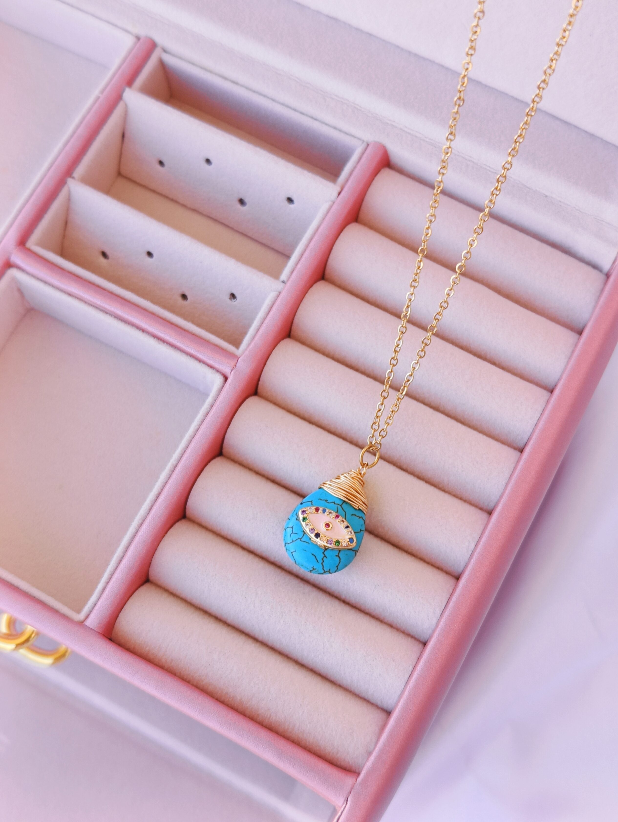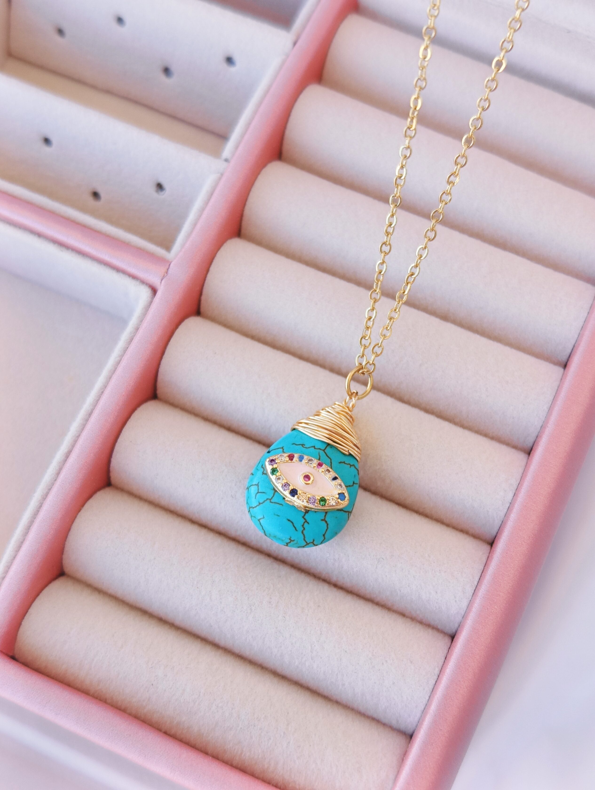 Κολιέ με γαλάζια πέτρα που έχει πάνω ένα ματάκι πολύχρωμο. Η αλυσίδα του είναι 45 εκ. και διαθέτει και επέκταση για να φοράτε σε ότι μήκος επιθυμείτε.