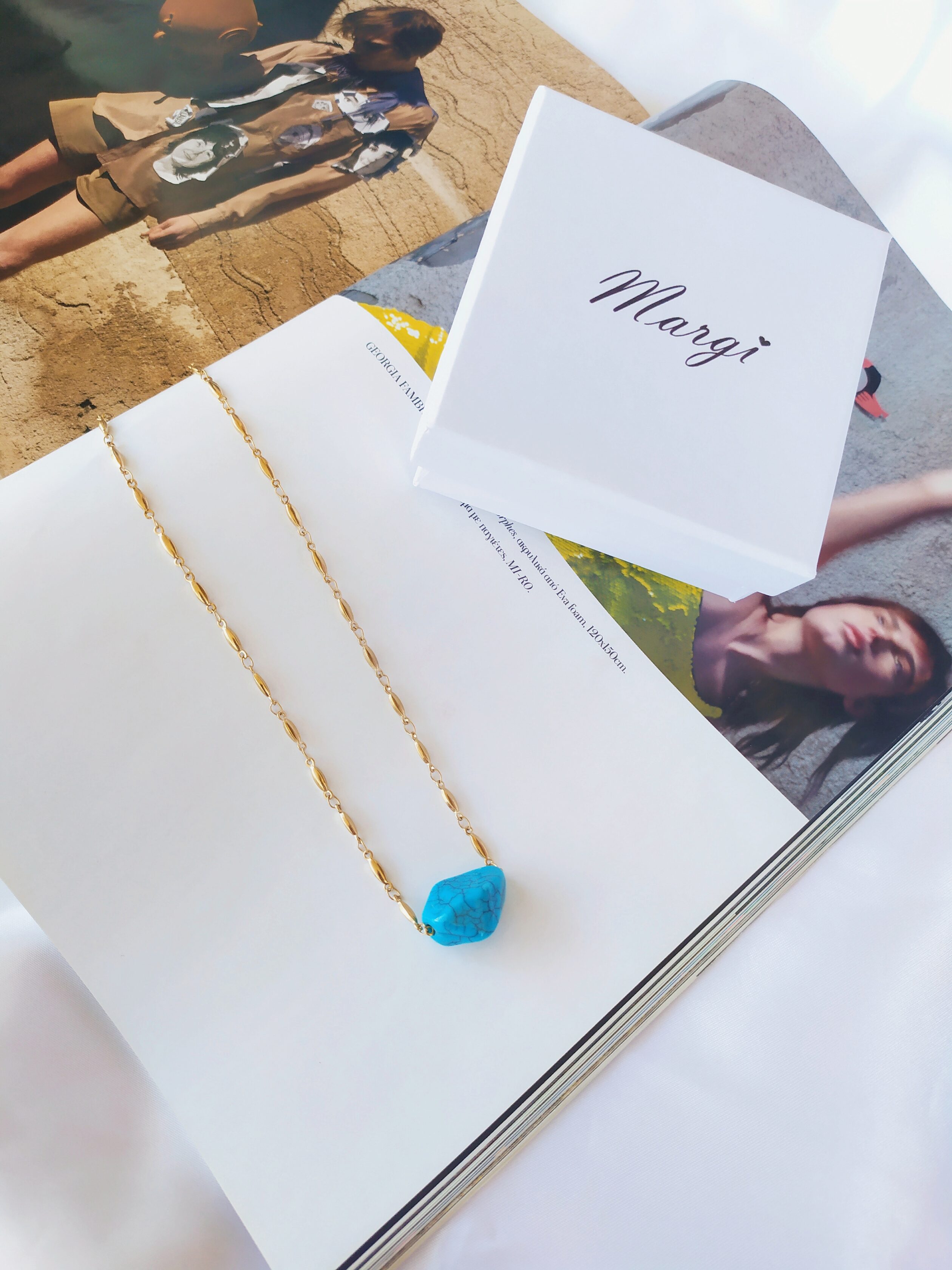 Αναδείξτε την κομψότητα και τη φυσική ομορφιά με αυτό το μοναδικό κολιέ. Η αλυσίδα από ανοξείδωτο ατσάλι με χρυσή επιμετάλλωση έχει μήκος 40  εκατοστά και με την επέκταση φτάνει τα 45 εκατοστά, προσφέροντας τέλεια εφαρμογή. Το κεντρικό στοιχείο είναι μια γαλάζια χάντρα. Ένα ιδανικό κόσμημα για καθημερινές εμφανίσεις αλλά και ιδιαίτερες περιστάσεις.