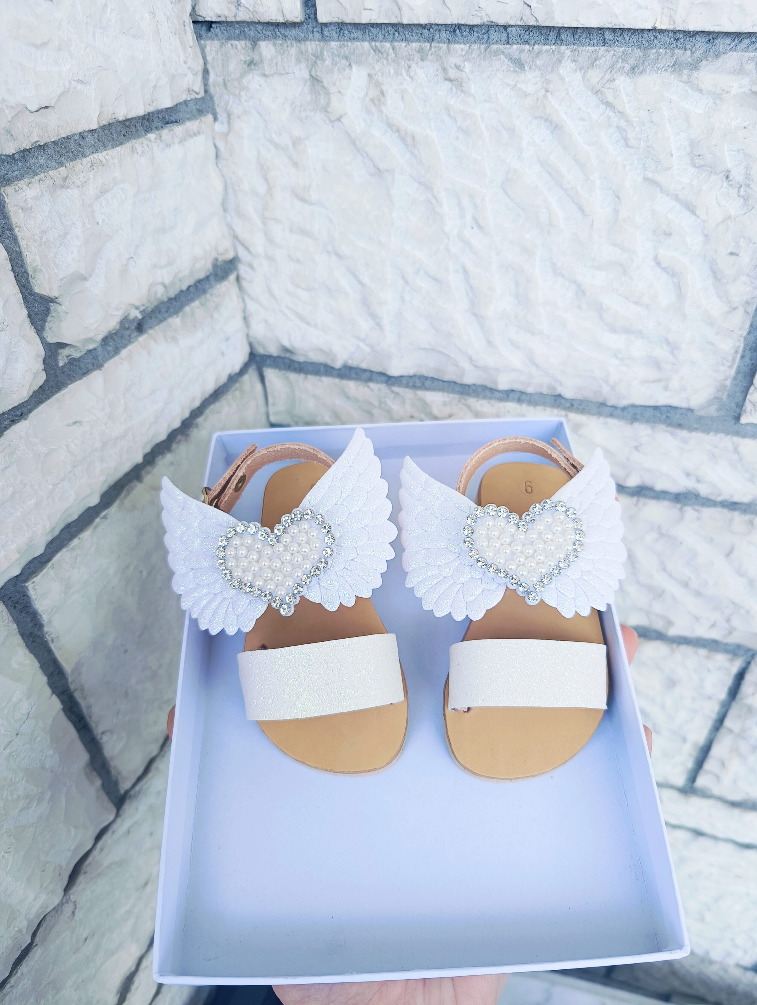 Μοναδικά χειροποίητα σανδάλια με καρδιά από στρας και λευκά φτερά, ιδανικά για ξεχωριστές εμφανίσεις.