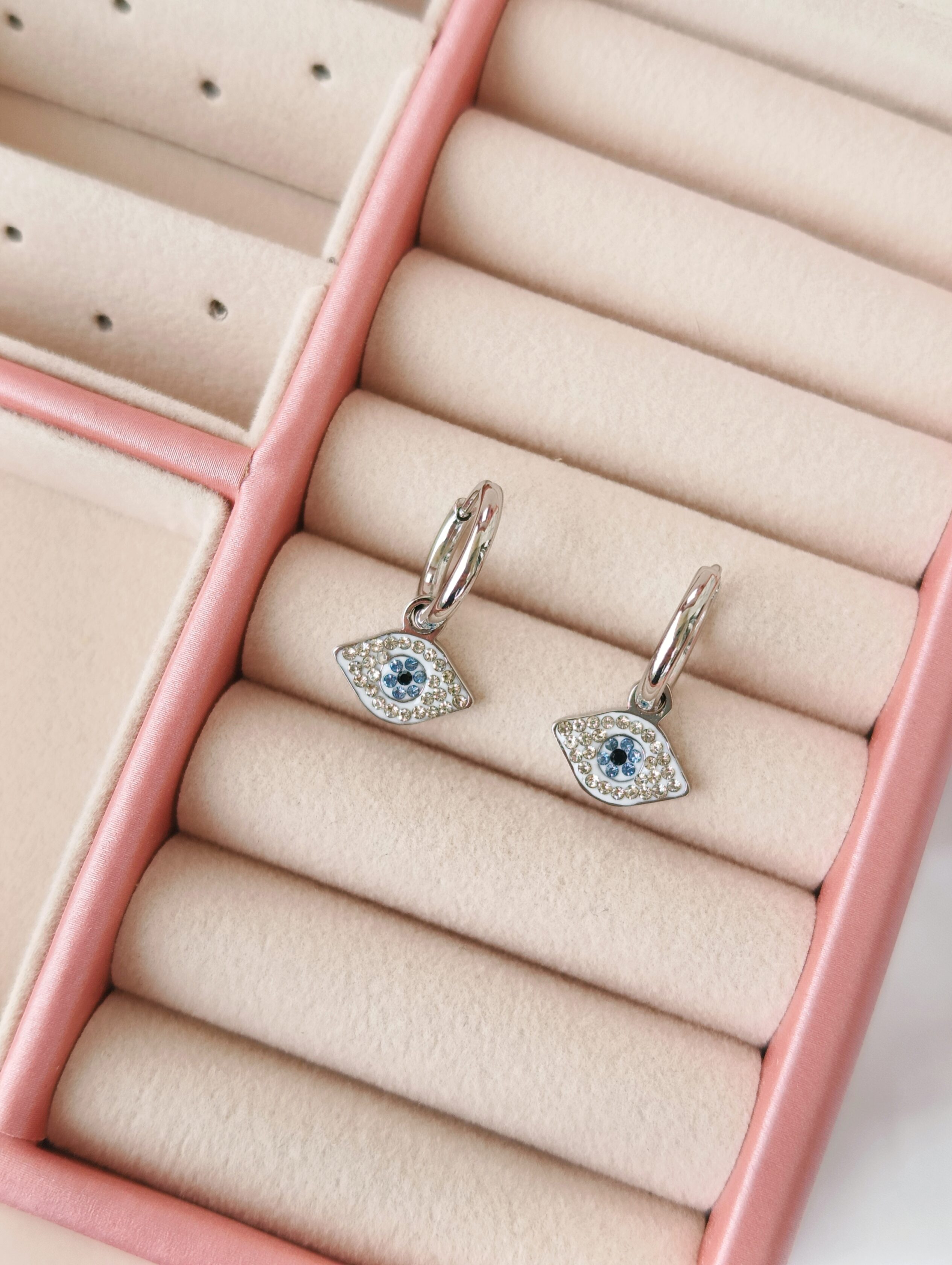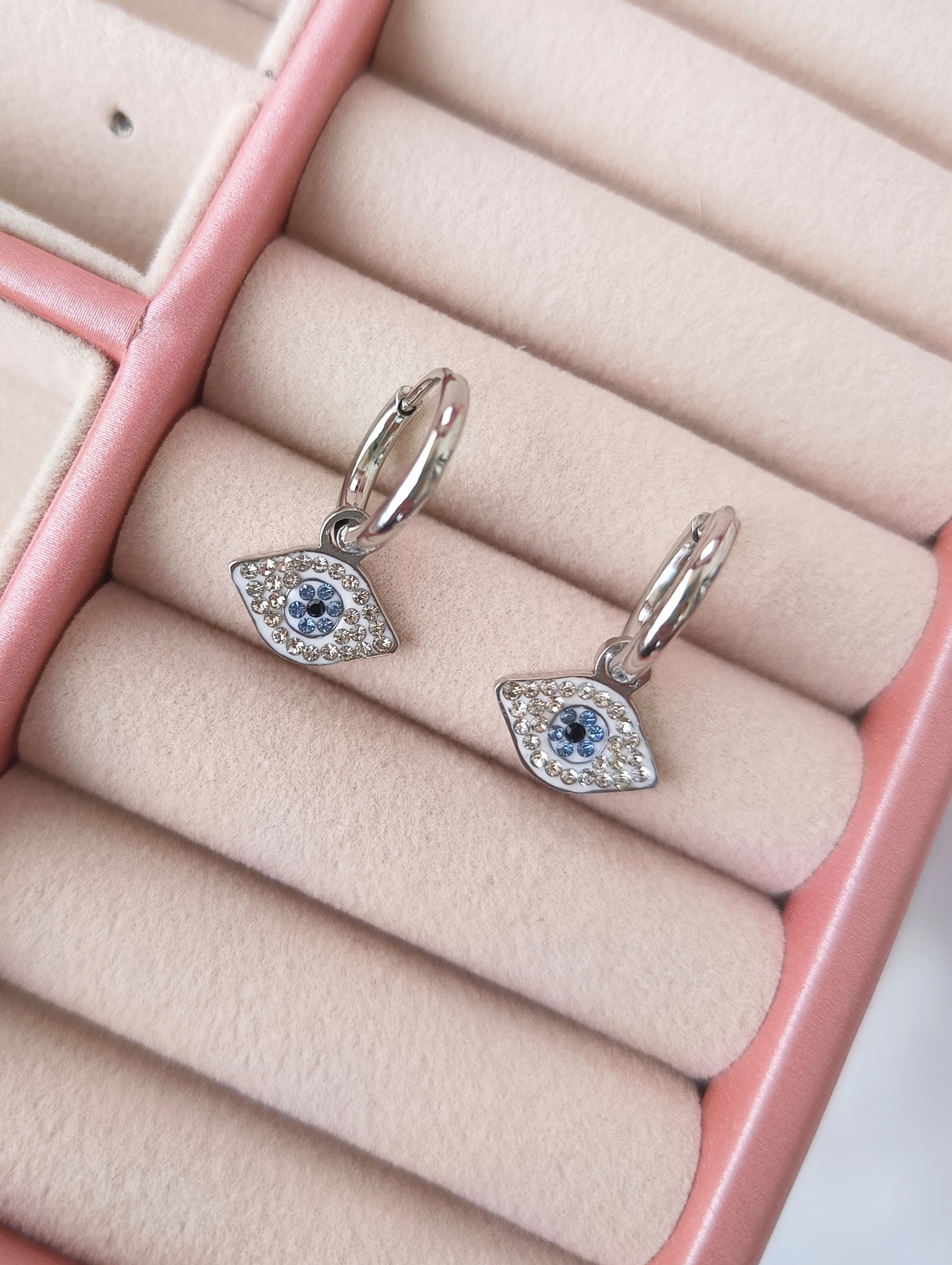 Αναδείξτε το στυλ σας με αυτά τα διαχρονικά σκουλαρίκια κρίκους, διακοσμημένα με ματάκι και λαμπερά στρας. Κατασκευασμένα από υψηλής ποιότητας ανοξείδωτο ατσάλι σε ασημί χρώμα, προσφέρουν ανθεκτικότητα και λάμψη που διαρκεί. Το ματάκι συμβολίζει την προστασία και την καλή τύχη, καθιστώντας τα μια εξαιρετική επιλογή τόσο για προσωπική χρήση όσο και για δώρο. Συνδυάζονται εύκολα με κάθε εμφάνιση, από casual έως πιο επίσημες περιστάσεις.